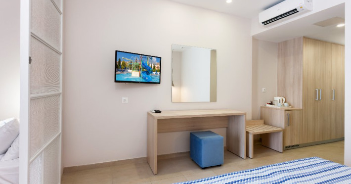 Dotari camere: Toate unitatile de cazare ofera urmatoarele: aer conditionat/incalzire individuala (gratuit), Wi-Fi (gratuit), linie directa telefon, seif (contra cost), TV cu ecran plat (satelit canale), frigider, baie privata cu cabina de dus, uscator de par, balcon/terasa, serviciu de menajera (de 6 ori pe saptamana), schimbarea prosoapelor (la fiecare 2 zile), schimbarea lenjeriei (la fiecare 3 zile), serviciu de spalatorie (contra cost).