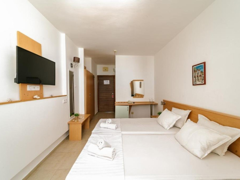 DOUBLE ROOM 2 + 0: Aprox. suprafata de 20 m2. Consta din doua paturi obisnuite. Toate camerele au vedere la mare si au aer conditionat, mini frigider (gol), TV satelit, Wi-Fi, telefon, balcon mobilat, baie cu dus si prosoape. Cazarea maxima este de 2 adulti.