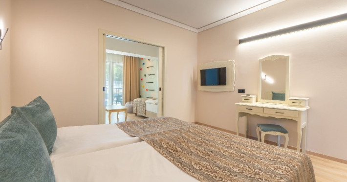 FAMILY 2+2: aproximativ 32 mp. Este format dintr-un dormitor cu 1 pat dublu si separat printr-o unitate cu usa glisanta cu 2 paturi de o persoana neextensibile. Toate camerele au baie cu dus, uscator de par, televizor, canapea, telefon, aer conditionat centralizat, TV satelit, meniu de perne, meniu de top saltele (la cerere), mini bar (apa minerala, bauturi racoritoare si bere, reaprovizionate zilnic), in - seif, balcon, Wi-Fi, facilitati pentru cafea si ceai. Capacitate maxima 3 adulti si 1 copil.