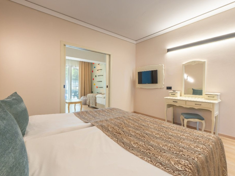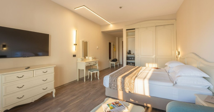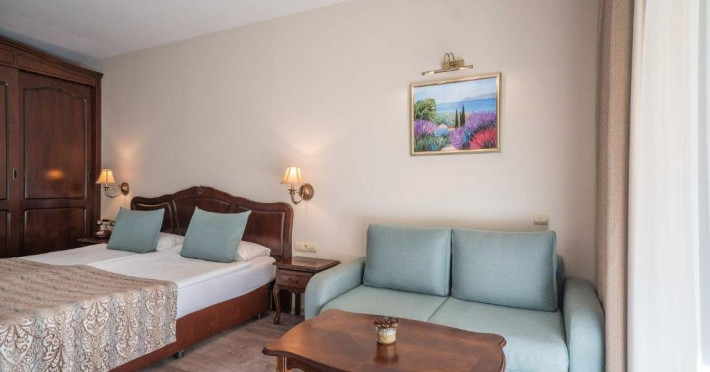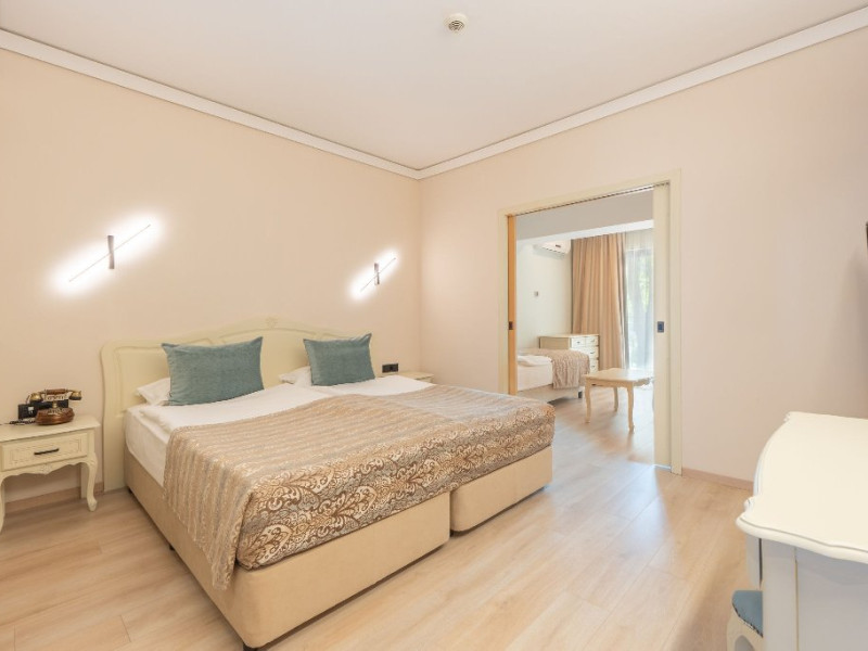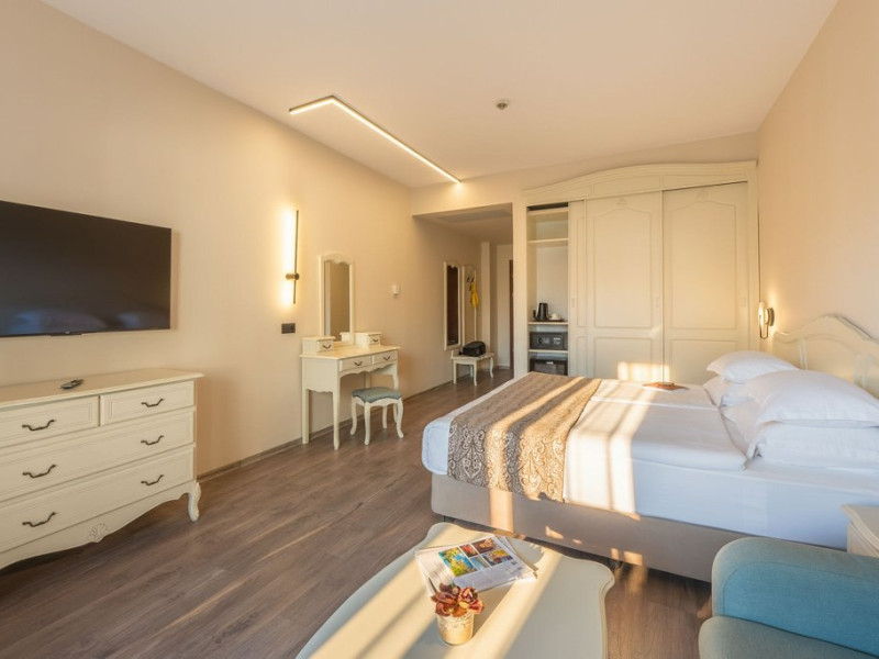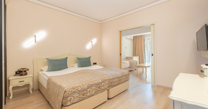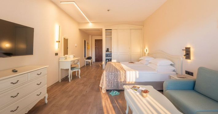 DBL 2+1 / 2+2 DELUXE: Aproximativ 25 mp. Doua paturi, unite ca pat dublu. Patul suplimentar este o canapea extensibila. Toate camerele au baie cu cada, uscator de par, TV, canapea, telefon, aer conditionat central, TV satelit, meniu de perne, meniu de top saltele (la cerere), minibar (apa minerala, bauturi racoritoare si bere, reaprovizionate zilnic), in - seif, balcon, Wi-Fi, facilitati pentru cafea si ceai. Capacitate maxima 3 adulti sau 2 adulti si 2 copii (pana la 7,99 ani)