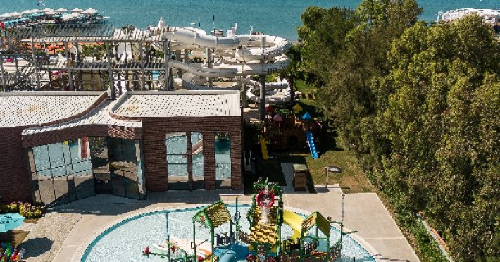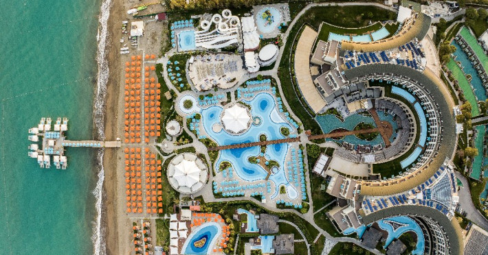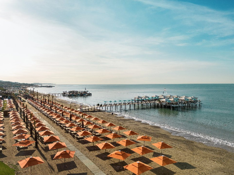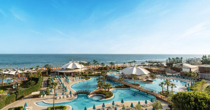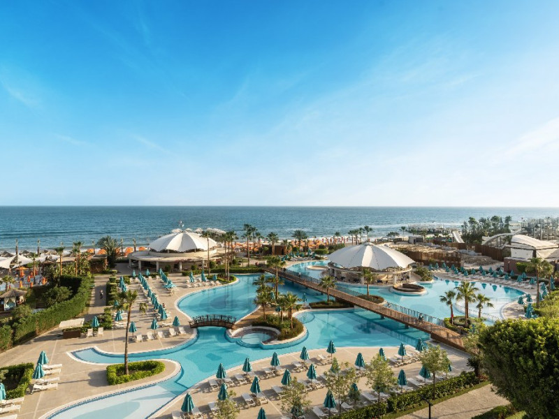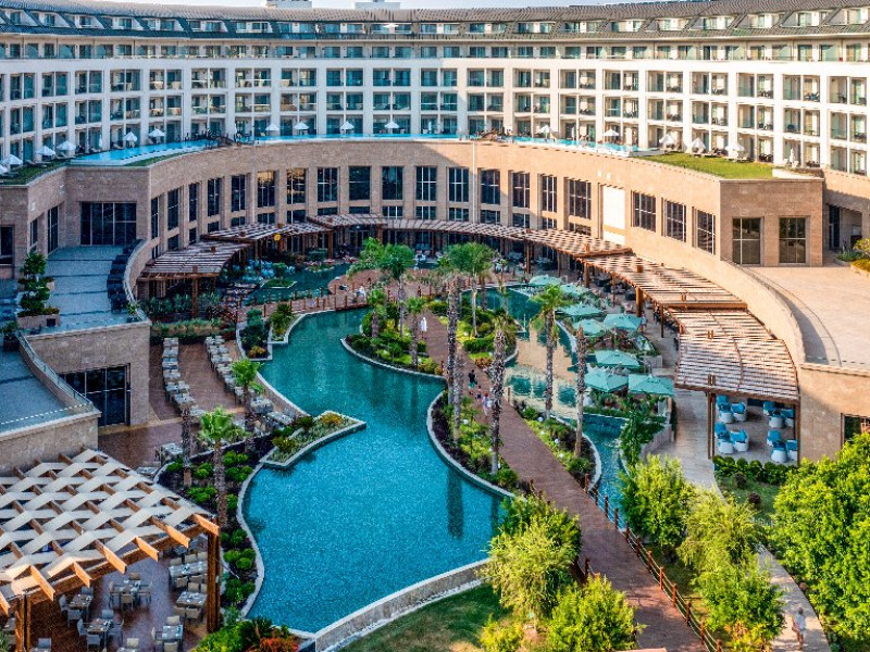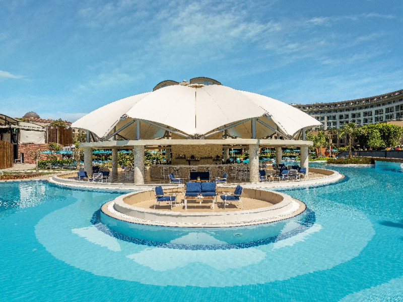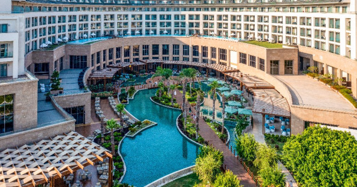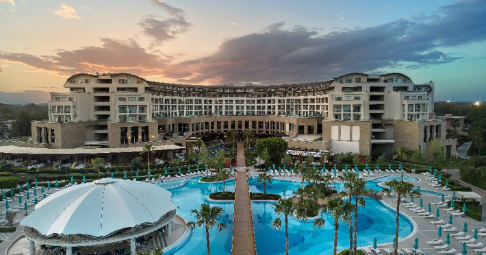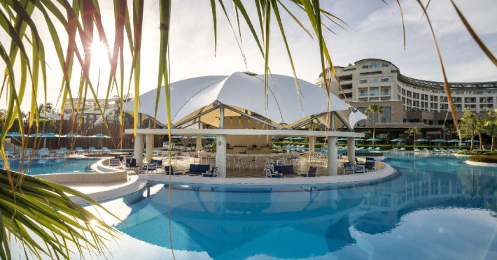 Facilitati hotel:Hotelul ofera oaspetilor sai urmatoarele facilitati: 5 restaurante a la carte (Italian Serafina, Asian Yada Sushi, Steak House , Develi Kebab 1912 , Mezo Fish Ala carte), 7 baruri, Street Food Corner, patiserie, fresh-uri din fructe, cocktailuri, discoteca, muzica live, programe de animatie, petreceri pe ponton, spectacole de dans, darts, gimnastica in apa, tenis de masa, aerobic, boccia, voley pe plaja, zumba, centru fitness, terenuri de tenis, terenuri de fotbal, internet wi-fi, centru spa (suprafata 3500 mp), 2 piscine interioare, sauna, baie turceasca, aquapark cu 8 tipuri de tobogane, piscina exterioara (3000 mp), piscina pentru copii, sali de conferinta.