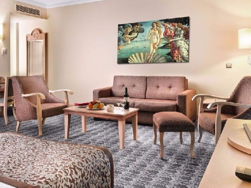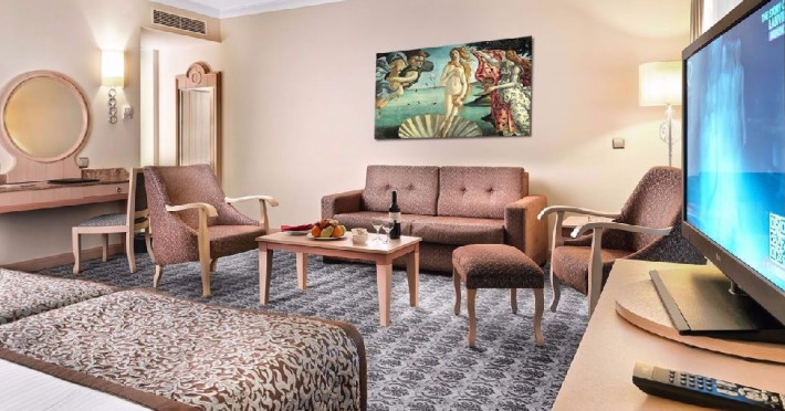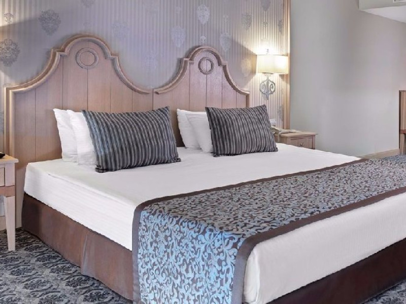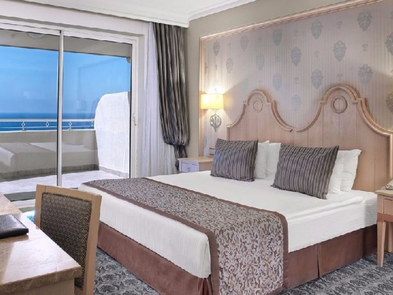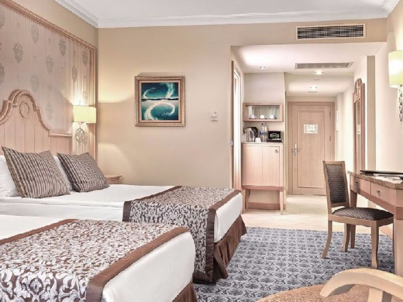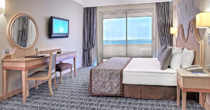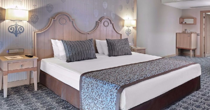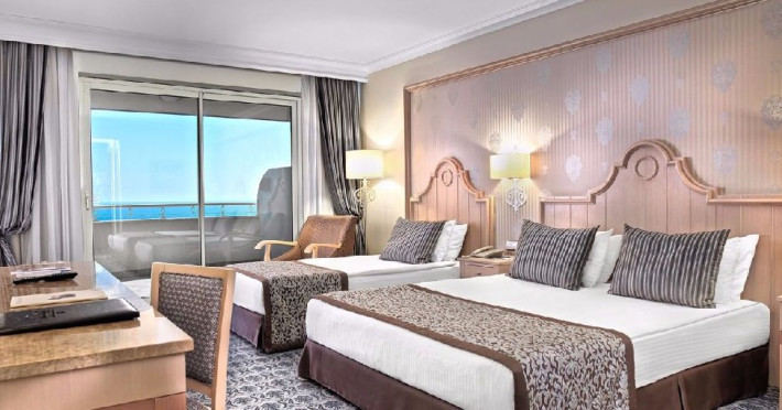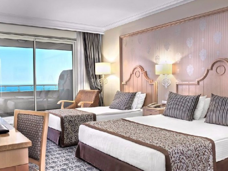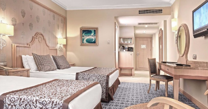 Facilitati camere: Hotelul are o cladire principala cu 7 nivele si 18 cladiri Club cu 2 nivele, are un numar total de 811 camere dispunde astfel: cladirea principala - 90 camere hotel standard taurus view , 136 camere hotel standard mediterranean, 4 junior suit, 3 deluxe suite , 4 corner jacuzzi suit , 3 king suit si 1 Presidential Suit. In sectiune de club a hotelului exista 452 camere superioare Club, 108 club jacuzzi duplex , 51 camere family club cu doua dormitoare, 51 camere family club cu trei dormitoare si 8 camere pentru persoane cu dizabilitati. Toate camerele dispun de baie, dus si uscator de par, aer conditionat centralizat, telefon direct, mini bar (apa, apa minerala, bauturi racoritoare si bere in camerele de hotel si doar apa si bauturi racoritoare in camerele de club - realimentat zilnic), seif, TV, conexiune la internet Wi-Fi, balcon