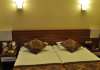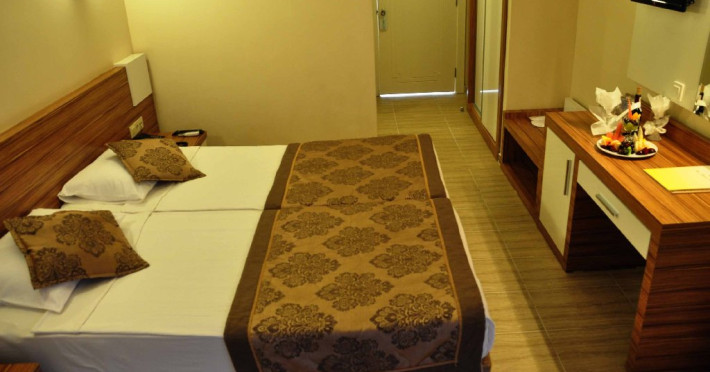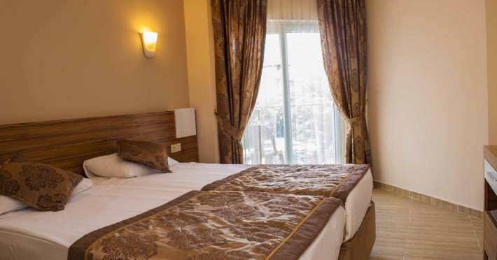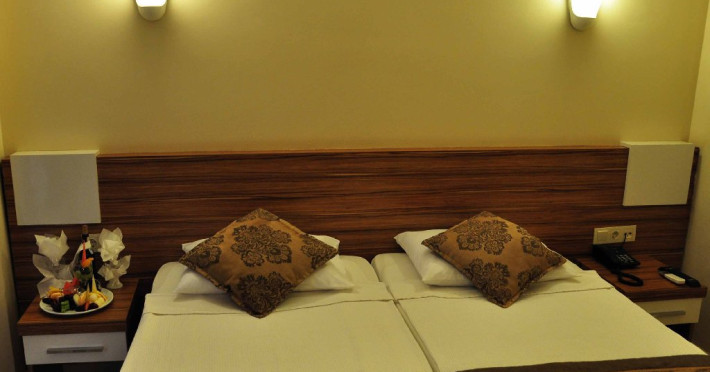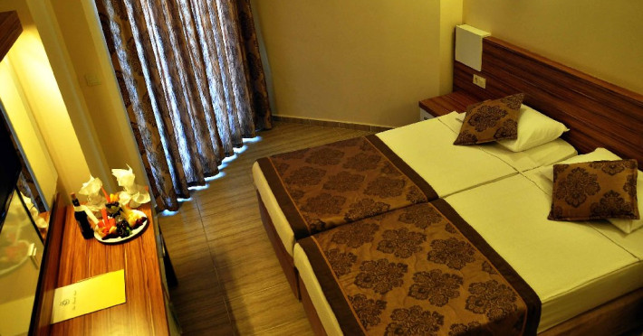Facilitati camere: Hotelul este impartit in 2 cladiri cu 5 niveluri, impartite in camera: Standard (un dormitor, o baie, max 2+1 pax), Family (un dormitor, un living room separat de dormitor printr-o usa, o baie, max 4 pax) si Economy sunt la fel ca si Standard Rooms, dar fara balcon si cu tavan inclinat. Toate camerele au baie cu dus si uscator de par, aer conditionat control individual, telefon direct, mini bar (realimentat zilnic cu apa), seif, podea ceramica, TV satelit si canale cu muzica, balcon.