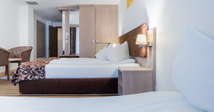 Camera Deluxe: - potrivita pentru familiile de doi adulti si un copil sau de doi adulti, un copil sub 6 ani si un copil peste 6 ani; - camera cu pat dublu si un fotoliu extensibil; - camerele deluxe se afla in corpul A al hotelului; - in camerele deluxe se pot caza cel mult doi adulti si un copil;