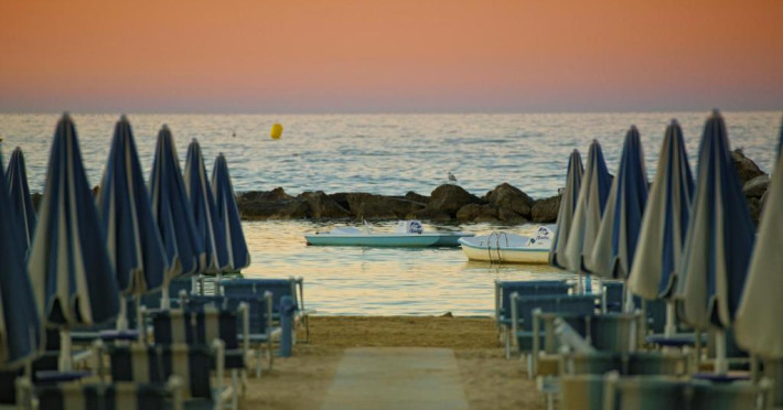 O pasarelă incantătoare din lemn separă terasele hotelului de nisipurile aurii ale plajei din Cattolica, care oferă o multitudine de facilităti.