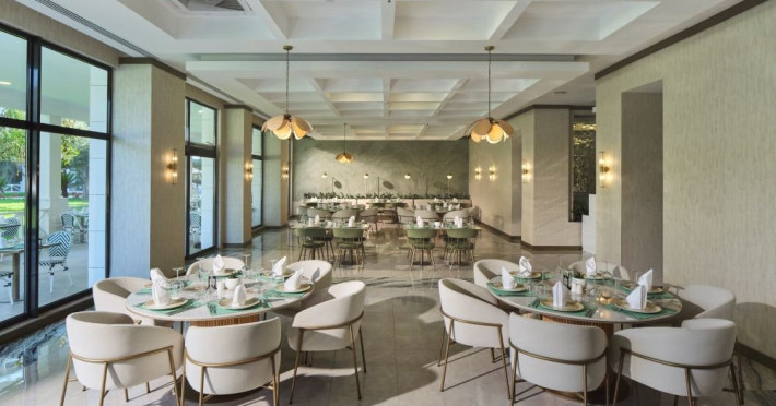 Facilitati hotel: Hotelul pune la dispozitia oaspetilor: restaurant, 6 restaurante a la carte, snack-bar, cigar bar, vitamin bar, patiserie, mai multe baruri inclusiv la piscina si la plaja, 6 piscine exterioare, 2 piscine interioare (una pentru copii), Aquapark, centru Spa, sala fitness, spectacole si muzica live, cinema, volei pe plaja, tenis, tenis de masa, billiard, yoga, pilates, sauna, sauna turceasca, diverse facilitati pentru animale de companie (pet-friendly), sali de conferinta.