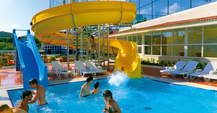 Facilitati hotel: Oaspetii pot beneficia de restaurant principal, restaurant A la Carte, baruri, piscina exterioara, piscina interioara, sezlonguri si umbrele, centru fitness, programe de animatie, aerobic, darts, tenis de masa, piscina pentru copii, tobogane, miniclub.